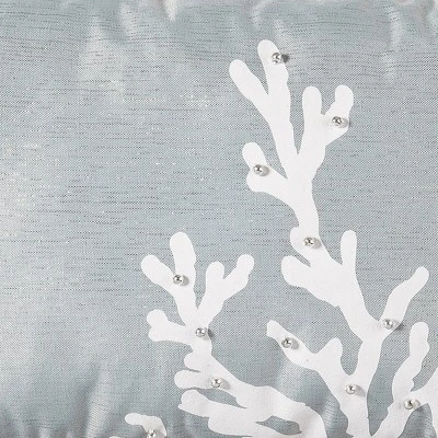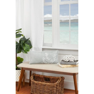 Let your coastal style shine with the casual yet refined look of Seafoam Blue Coral accent pillow. With its subtle blue undertones and a few elegant beads on printed white coral, this oblong pillow fits right in with your balanced coastal decor. Style this pillow with more from the Seafoam Blue Coral collection to create a coordinated look that is perfect for special occasions or for your everyday sophisticated style. Accent pillows add both comfort and artful appeal to any area of your home, toss this one on your couch or pair with your favorite coastal or nautical bedding collection for a bedroom makeover. Crafted with a polyester cover and finished with a white piped edge, this pillow is filled with plush polyester filling and sewn closed. Size: 9 x 18 inches. Spot cleaning recommended.